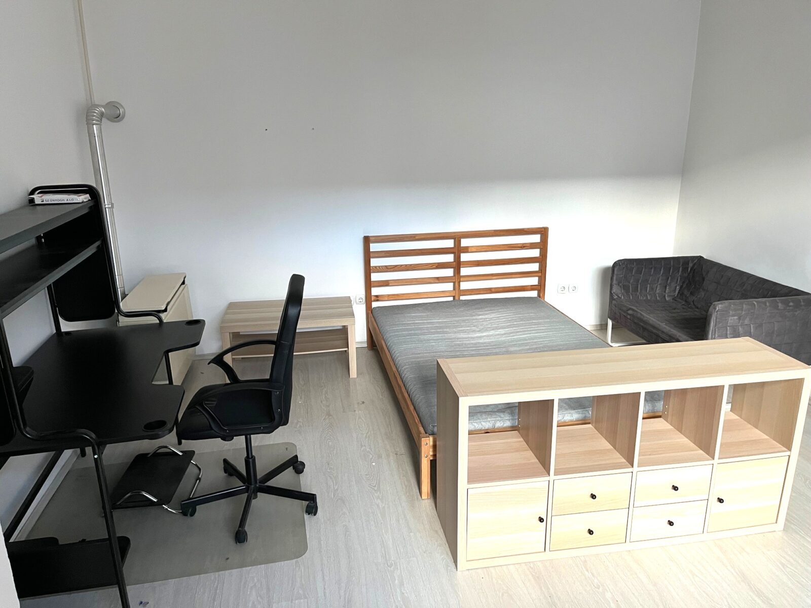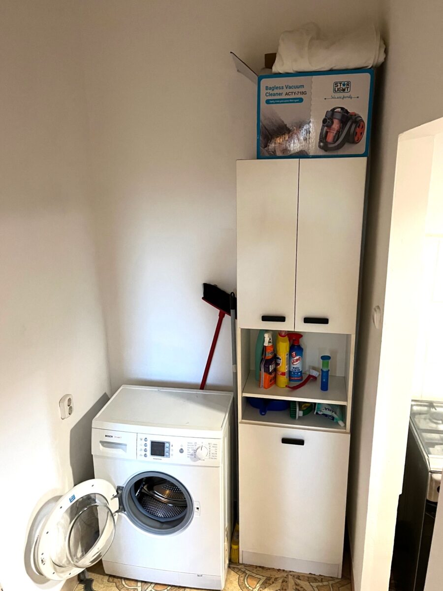 Layout: kitchen, large living room with huge window and bathroom with shower + laundry room